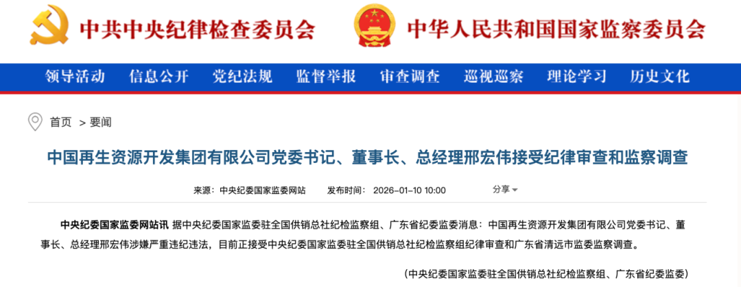 据中央纪委国度监委驻寰球供销总社纪检监察组、广东省纪委监委音书:中国再生资源开发集团有限公司党委通知、董事长、总司理邢宏伟涉嫌严重非法违法,现在正袭取中央纪委国度监委驻寰球供销总社纪检监察组治安审查和广东省清远市监委监察探询。