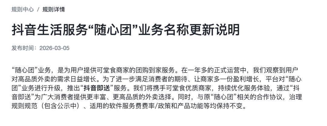 3月5日,抖音将「随性团」认真更名为「抖音即送」,一个是团,一个是送,此次更名的背后意味着什么?