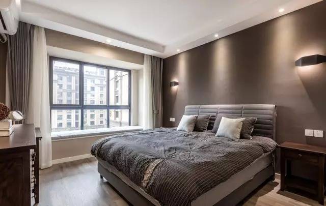 ▲卧室的筹算更偏向深颜色,营造出逍遥又温馨的休眠空间。棕灰色布景墙与深灰色床品花样一样又有互异,各有特质。