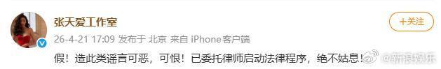 4月21日,张天爱责任室发文辟谣:“假!造此类坏话可恶,可恨!已交付讼师出手法律法式,毫不姑息! ”